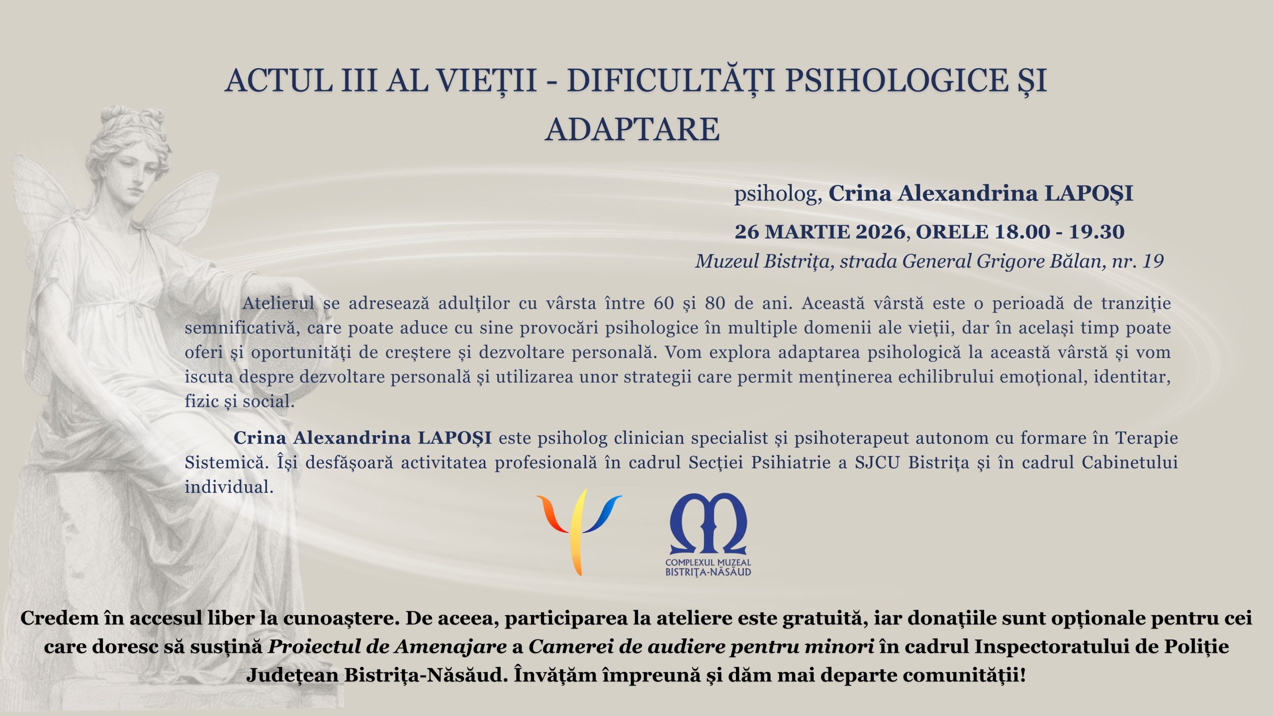 Colegiul Psihologilor din România – Filiala Bistrița-Năsăud, în parteneriat cu Complexul Muzeal Bistrița-Năsăud, lansează în luna martie 2026 programul „Muzeul ca spațiu al echilibrului. Ateliere de psihologie și cultură interioară”, dedicat comunității locale.