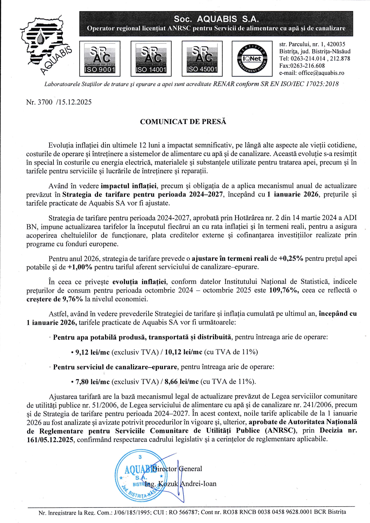 Aquabis a transmis o informare privind ajustarea prețurilor și tarifelor practicate începând cu data de 1 ianuarie 2026, în conformitate cu evoluția inflației din ultimele 12 luni și cu Strategia de tarifare pentru perioada 2024–2027. Abonare la newsletter: Trimite Share