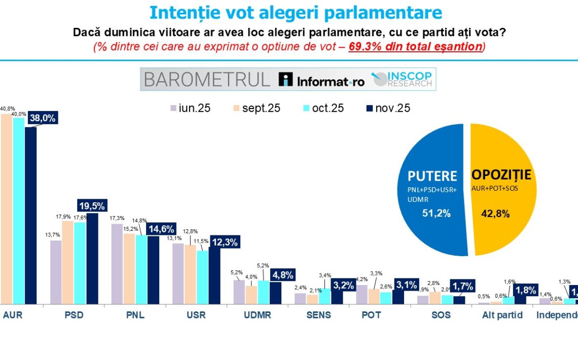 Un sondaj Informat.ro – INSCOP Research, realizat în perioada 25 octombrie – 2 noiembrie, arată că prima poziție în topul opțiunilor de vot este ocupată de AUR, cu 38% dintre opțiuni. Urmează PSD – 19,5% și PNL – 14,6%.