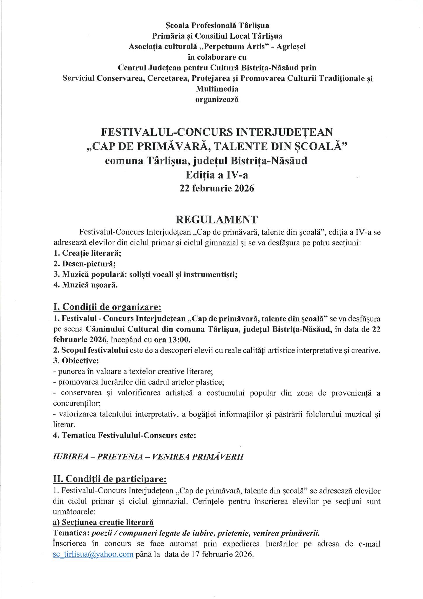 Centrul Județean pentru Cultură Bistrișa Năsăud anunță cu mare bucurie organizarea ediției a IV-a a Festivalului-Concurs Interjudețean „Cap de Primăvară, Talente din Școală”, un eveniment dedicat elevilor talentați și pasionați de artă.