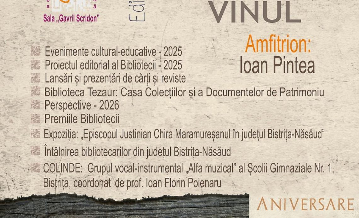 Miercuri, 17 Decembrie 2025, ora 12:00, în Sala „Gavril Scridon” a Bibliotecii Județene „George Coșbuc” Bistrița-Năsăud (Str. Alexandru Odobescu, nr. 11).