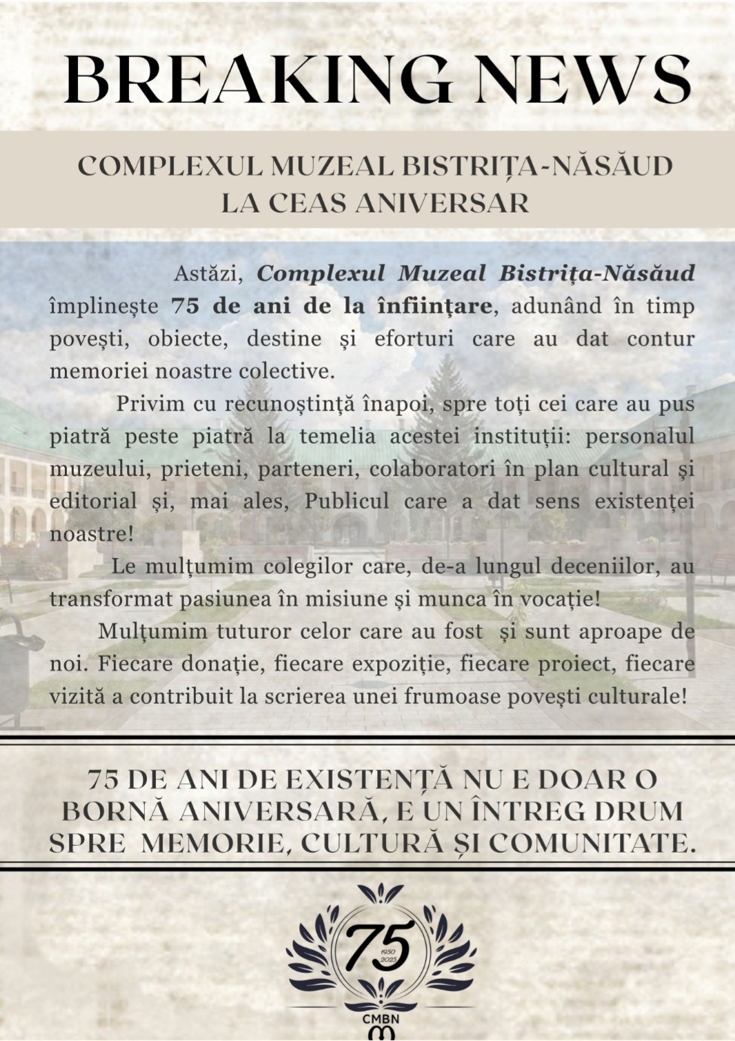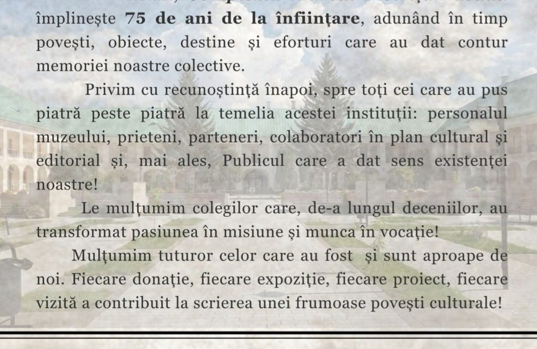 𝗢 𝗷𝘂𝗺𝗮̆𝘁𝗮𝘁𝗲 𝗱𝗲 𝘀𝗲𝗰𝗼𝗹 𝘀̦𝗶 𝗶̂𝗻𝗰𝗮̆ 𝘂𝗻 𝘀𝗳𝗲𝗿𝘁 𝗱𝗲 𝘃𝗲𝗮𝗰 – 𝟳𝟱 𝗱𝗲 𝗮𝗻𝗶 𝗱𝗲 𝗰𝗲𝗿𝗰𝗲𝘁𝗮𝗿𝗲, 𝗰𝗼𝗻𝘀𝗲𝗿𝘃𝗮𝗿𝗲 𝘀̦𝗶 𝗽𝗿𝗼𝗺𝗼𝘃𝗮𝗿𝗲 𝗮 𝗺𝗲𝗺𝗼𝗿𝗶𝗲𝗶 𝗻𝗼𝗮𝘀𝘁𝗿𝗲 𝗰𝘂𝗹𝘁𝘂𝗿𝗮𝗹𝗲, 𝗶̂𝗻 𝘀𝗹𝘂𝗷𝗯𝗮 𝗰𝗼𝗺𝘂𝗻𝗶𝘁𝗮̆𝘁̦𝗶𝗶 𝘀̦𝗶 𝗮 𝗽𝗮𝘁𝗿𝗶𝗺𝗼𝗻𝗶𝘂𝗹𝘂𝗶. Abonare la newsletter: Trimite Share