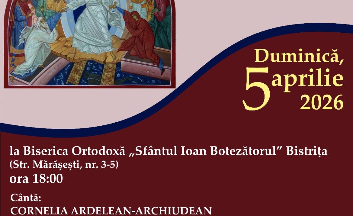 Evenimentul va avea loc Duminică, 5 aprilie 2026, la Biserica Ortodoxă „Sfântul Ioan Botezătorul” Bistrița (Str. Mărășești, nr. 3-5), ora 18:00.