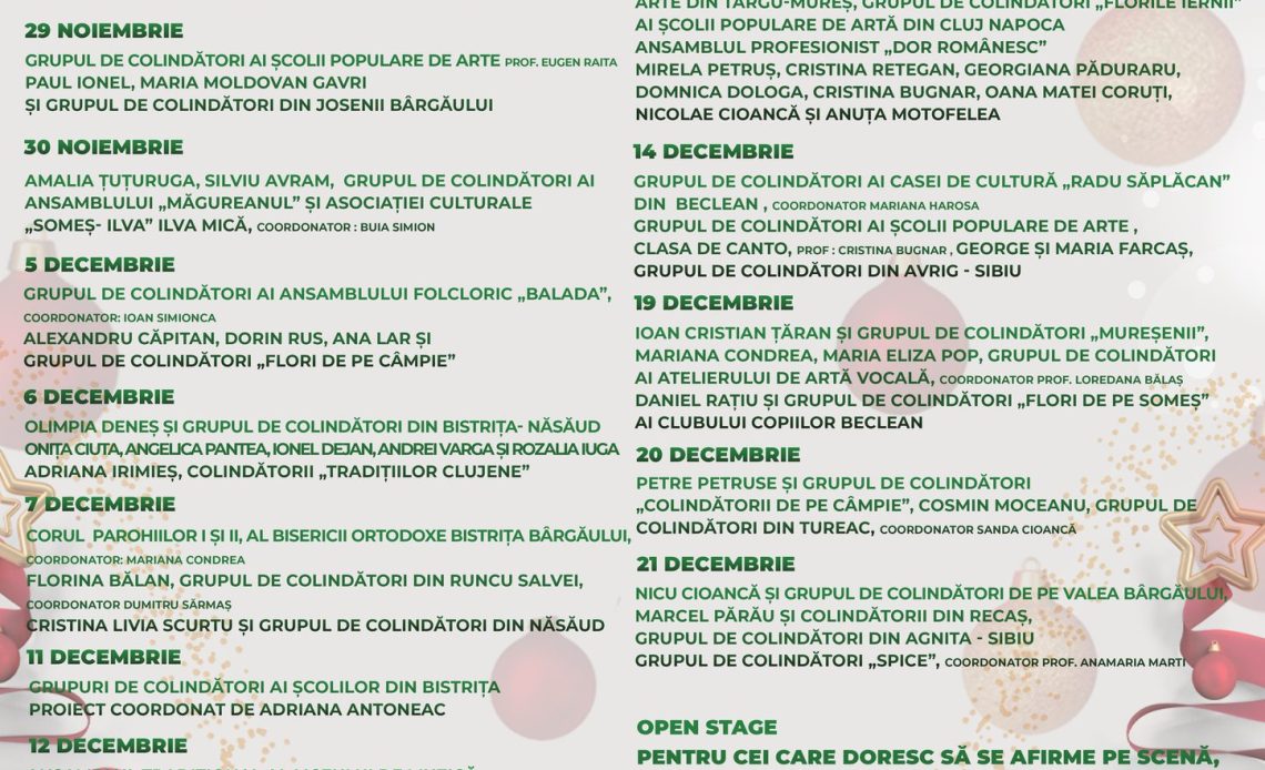 Pe Pietonalul „Liviu Rebreanu”, în fiecare zi de vineri, sâmbătă și duminică de la ora 18:00, vom avea parte de colinde, tradiții, momente speciale pregătite de artiști, ansambluri și grupuri de colindători din Bistrița și din întreaga țară.
