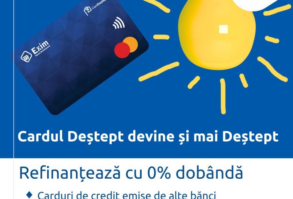 Exim Banca Românească derulează o campanie promoțională pentru cardurile de credit Mastercard Standard și Mastercard Gold care pot fi utilizate acum și pentru refinanțarea creditelor existente, cu un mare avantaj: RATE FĂRĂ DOBÂNDĂ!