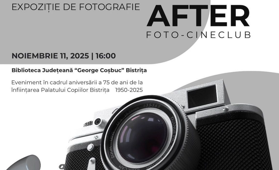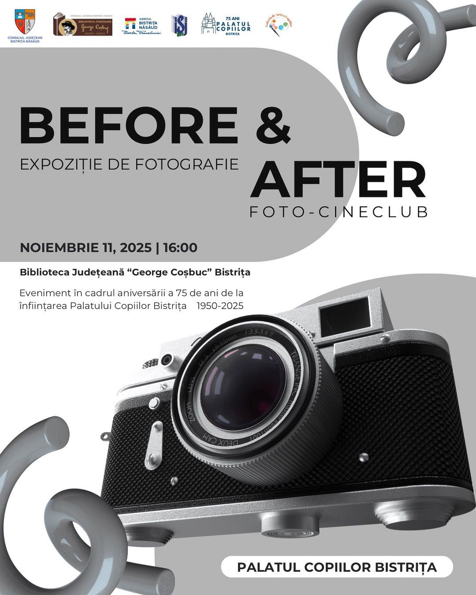Consiliul Județean Bistrița-Năsăud, Inspectoratul Școlar Județean Bistrița-Năsăud, Biblioteca Județeană „George Coșbuc” Bistrița-Năsăud și Palatul Copiilor Bistrița vă invită marți, 11 noiembrie 2025, ora 16:00, în Galeria de Artă a Copiilor din Clubul Cultural CoșBook (Bistrița, Str. Alexandru Odobescu, nr. 11) la deschiderea Expoziției de fotografie ”Before & After. Foto-Cineclub”,