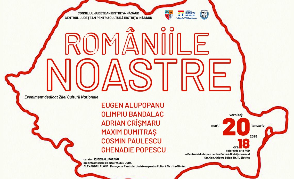 Consiliul Județean Bistrița-Năsăud, prin Centrul Județean pentru Cultură Bistrița-Năsăud, organizează marți, 20 ianuarie 2026, de la ora 18:00, la Galeria de Artă ROD a Centrului Județean pentru Cultură Bistrița-Năsăud (Str. Gen. Grigore Bălan, nr. 11, Bistrița), vernisajul expoziției „Româniile noastre”, eveniment dedicat Zilei Culturii Naționale.
