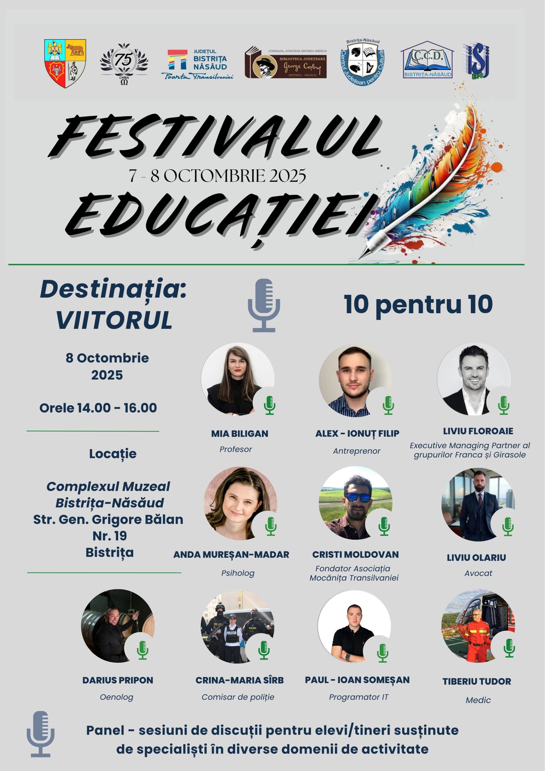 • Panelul „Destinația: Viitorul – 10 pentru 10”, cu zece speakeri inspiraționali din diverse domenii (Complexul Muzeal Bistrița-Năsăud, 8 octombrie);