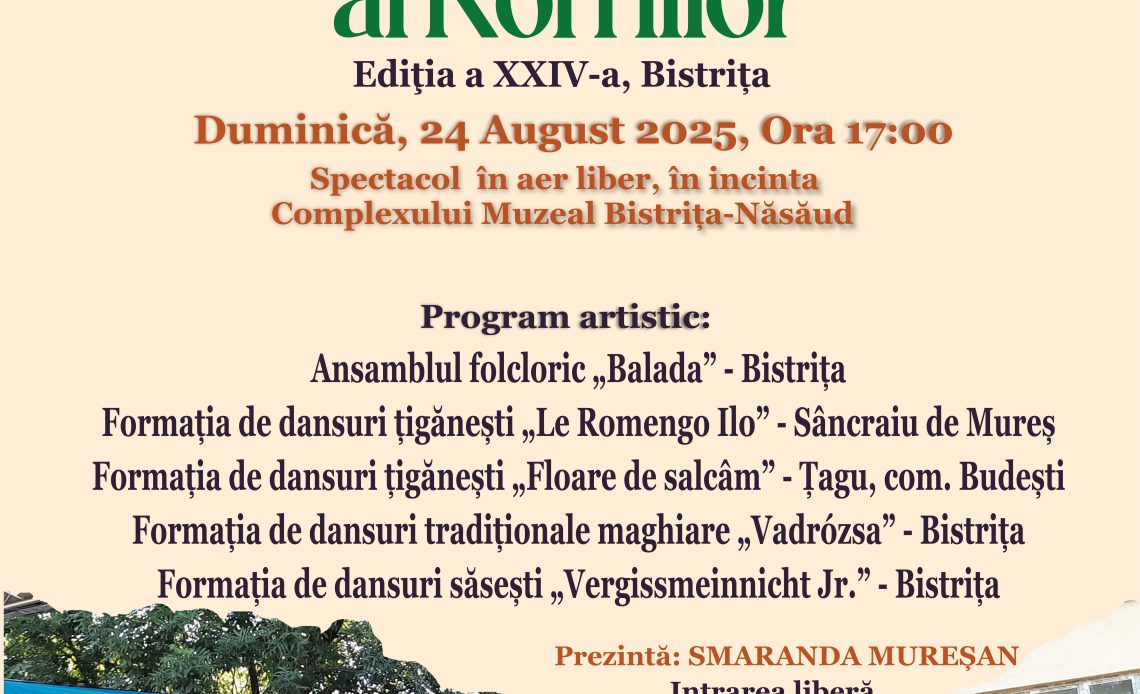 CONSILIUL JUDEȚEAN BISTRIȚA-NĂSĂUD, CENTRUL JUDEȚEAN PENTRU CULTURĂ BISTRIȚA-NĂSĂUD, Serviciul Conservare, Cercetare, Protejarea și Promovarea Culturii Tradiționale și Multimedia, COMPLEXUL MUZEAL BISTRIȚA-NĂSĂUD în colaborare cu PARTIDA ROMILOR „PRO-EUROPA” – SUCURSALA JUDEȚEANĂ BISTRIȚA-NĂSĂUD organizează Festivalul Traditional al Romilor Ediţia a XXIV-a, Bistrița.