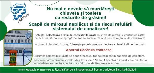 Nu uita că ai la îndemână în oraș pubelele de colectare a grăsimilor alimentare uzate, nemaifiind nevoie să produci miros urât în incinta gospodăriei prin aruncarea uleiului în scurgerea chiuvetelor sau în toaletă.