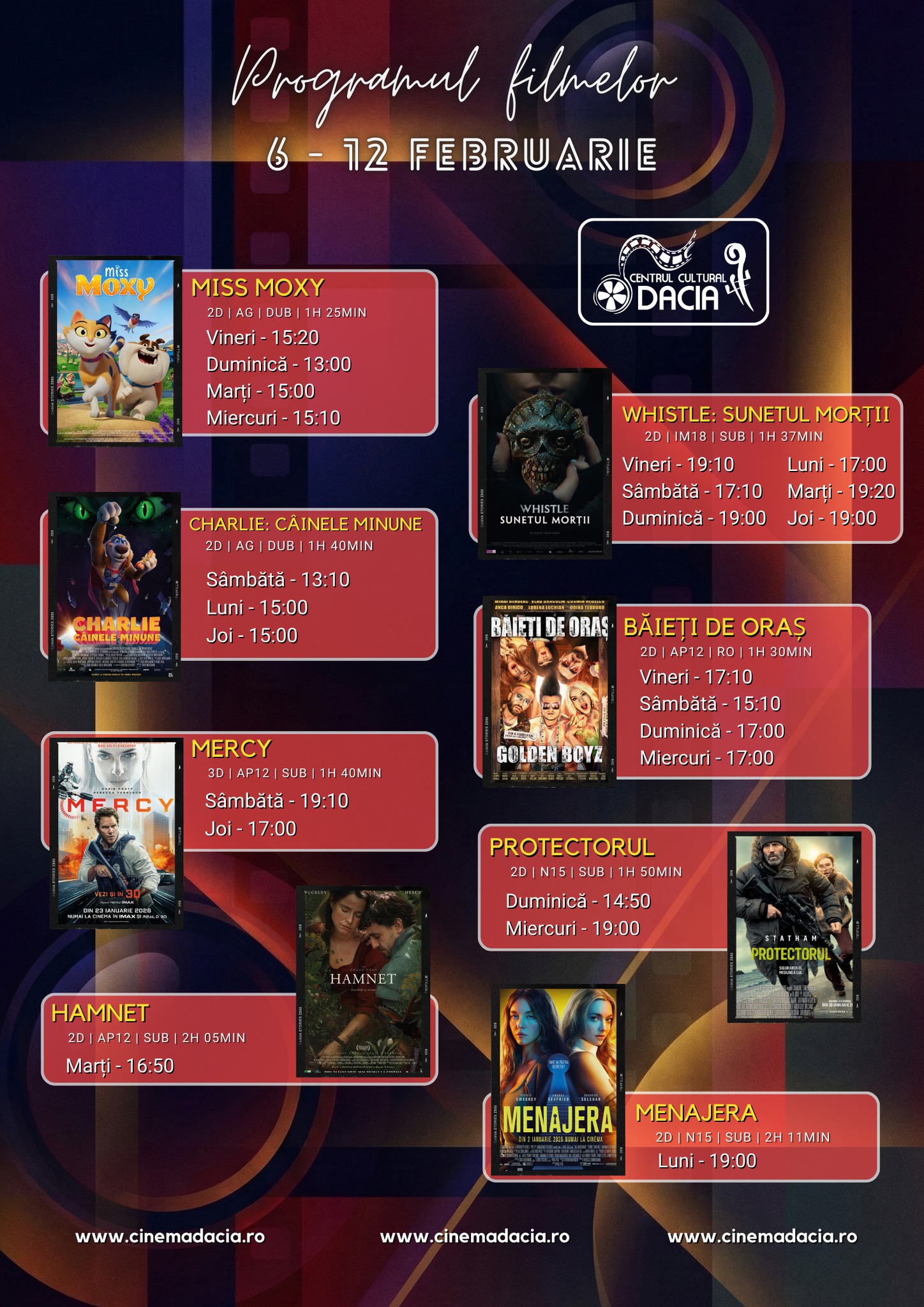 Programul filmelor din perioada 6-12 februarie Bilete și rezervari — www.cinemadacia.ro Abonare la newsletter: Trimite Share