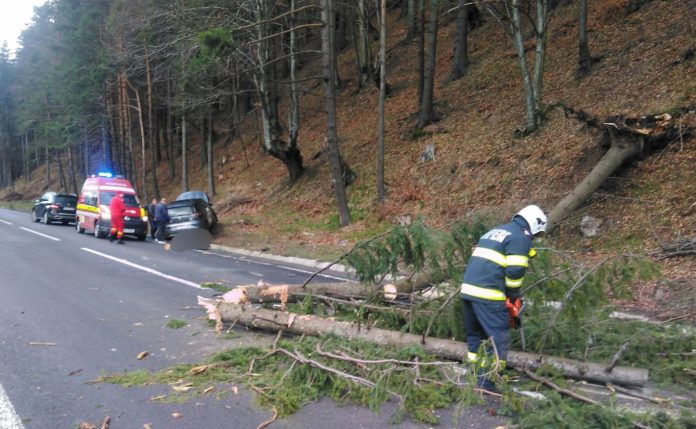 Un copac a căzut în această dimineață peste o mașină în care se aflau șapte persoane, în Mureșenii Bârgăului.